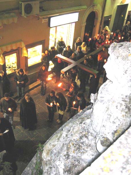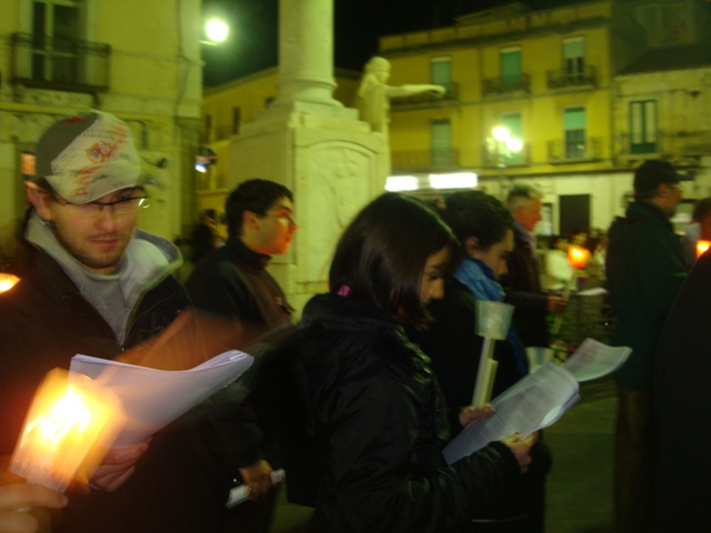 PIZZO - Un corteo di preghiera, oltre quattrocento candele accese, tantissimi giovani e profonda spiritualità. Questi gli elementi cardine della Via Crucis che si è svolta, nel pomeriggio di sabato scorso, nella città napitina. La partecipata iniziativa, realizzata dalla Consulta di Pastorale Giovanile Diocesana, guidata dal responsabile Don Domenico Muscari, è stata intrapresa con la collaborazione e l'appoggio dei tre parroci della città: padre Nicola Colao, don Antonio Gaccetta e padre Filippo Di Francia. Il rito religioso di commemorazione del Cristo sulla via della crocifissione ha visto partecipi, oltre ai tantissimi fedeli napitini, numerosissimi giovani della Consulta di Pastorale Giovanile Diocesana provenienti da Pizzo e dai paesi limitrofi: Capistrano, Filadelfia, Monterosso, Montesoro e San Nicola da Crissa. E proprio i giovani della Consulta, lungo il tragitto, hanno ricordato il drammatico epilogo della vita del Cristo portando a spalla una poderosa croce in legno lunga cinque metri e larga tre. Le meditazioni, partendo dalla Chiesa di San Rocco e San Francesco di Paola, sono proseguite lungo Corso S. Francesco e Corso Garibaldi. Attraversata Piazza della Repubblica la Via Crucis ha fatto quindi sosta presso la Chiesa di San Giorgio. Da qui la ha continuato in direzione “Spuntone”, scendendo dritto fino alla Marina, raggiungendo la Chiesa di Maria SS. Immacolata e San Ferdinando Re per concludersi, infine, con un momento di riflessione presso la località del quartiere Marina nota come “Pizza a Pundi”. Qui molto toccante è stata la cerimonia di consegna della croce lignea ai giovani di Capistrano che la porteranno nuovamente in Via Crucis sabato prossimo per le vie della loro cittadina. Nel manifestare l'unitarietà delle parrocchie e l'operatività della Consulta, il momento di preghiera ha rappresentato, altresì, la testimonianza concreta di una Chiesa attenta ai segni di cambiamento e ai bisogni spirituali delle generazioni. Le comunità parrocchiali, inoltre, già nell'annunciazione del rito di sabato scorso hanno rimarcato, anche a seguito delle polemiche che hanno vivacizzato la cronaca locale negli ultimi periodi, la propria fedeltà agli insegnamenti del magistero del Papa e dei vescovi invitando i fedeli «ad un rinnovato impegno nella conoscenza delle direttive ecclesiastiche al fine di evitare commenti inutili, inappropriati e non veritieri».