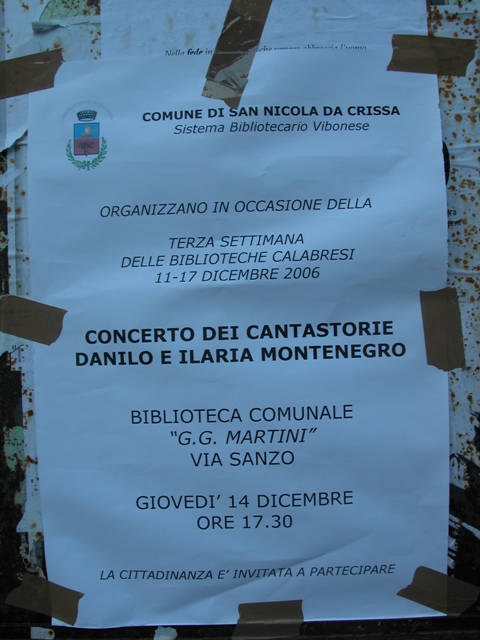 In occasione della “3° Settimana delle Biblioteche Calabresi” promossa dalla Regione Calabria e Sistema Bibliotecario Vibonese sul tema “La biblioteca centro dei processi comunicativi – oralità, scrittura, multimedialità”, la Biblioteca comunale di San Nicola da Crissa aderisce all’iniziativa proponendo uno spettacolo del “neocantastorie” Danilo Montenegro e di sua figlia Ilaria.